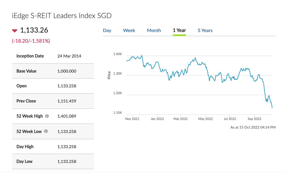 One look at returns so far in 2022 has been nothing but depressing/disappointing/abysmal. The first screenshot was directly taken from Syfe website. And the second screenshot was from i-edge website (1- year return). Any person who can read a simple graph can tell that in correlation with our depressing economy worldwide, REITs have also not been spared in this blood bath. If it makes you feel any better, the SPDR S&P 500 ETF has registered a -19.83% 1-year return while the SPDR Dow Jones Industrial Average ETF trust has lodged a -15.91% 1- year return so far.