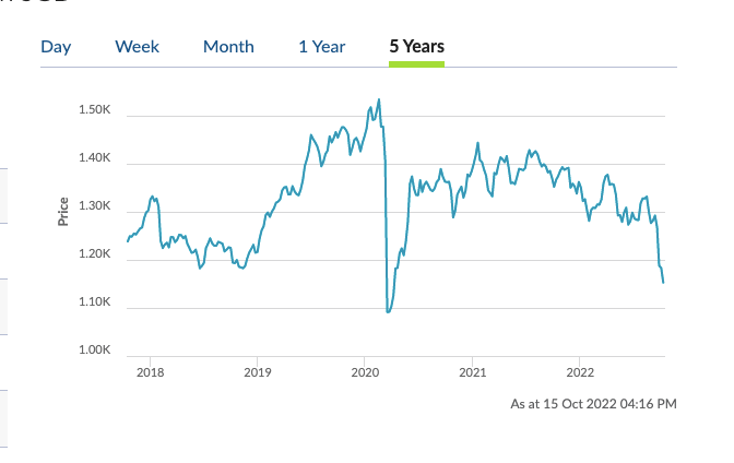 And as we zoom the graph out to 5 years, the iEdge S-Reit Leaders Index is almost going to hit its historical rock bottom in year 2020 during Covid-19 pandemic times (which was unexpectedly staged with a rebound).